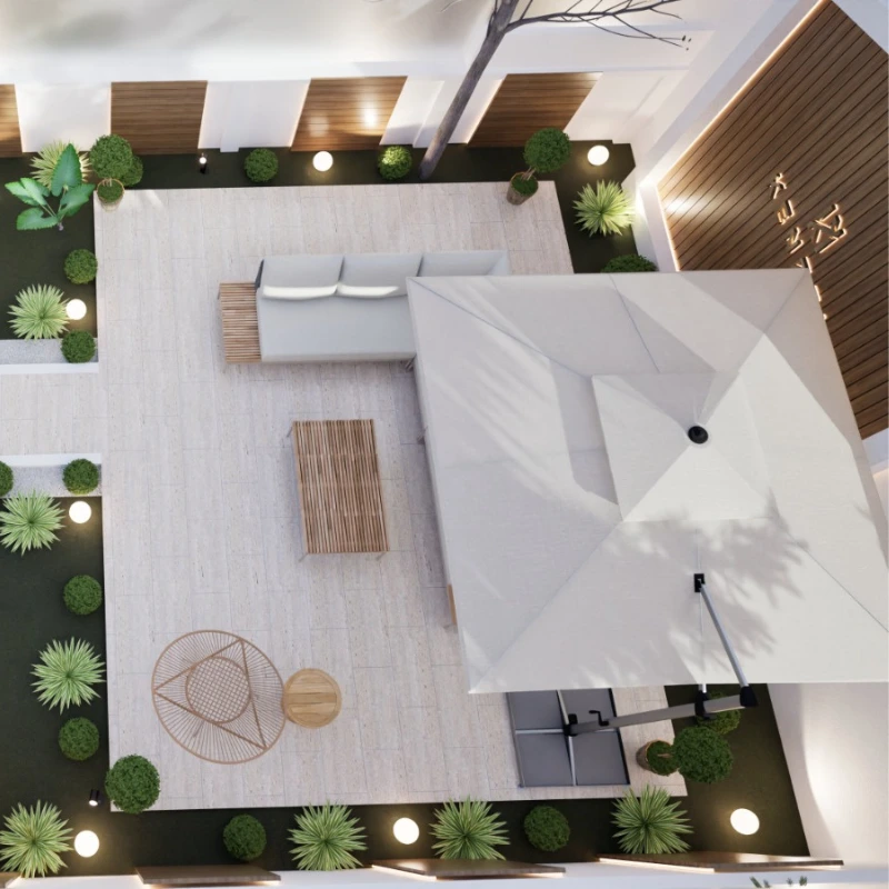 Tasarımın en etkileyici yönlerinden biri, “çok kotlu yeşil avlu düzenlemesi”dir. Farklı seviyelerde oluşturulan oturma nişleri, mekana dinamizm katarken, aynı zamanda kullanıcılara farklı mahremiyet seviyelerinde ve farklı perspektiflerde dinlenme ve sosyalleşme imkanı sunar. Bu amfi benzeri yapı, peyzajın sadece seyredilen bir şey değil, aynı zamanda içinde yaşanan, aktif olarak kullanılan bir mekana dönüşmesini sağlar. Bu, son yıllarda popülerliği artan “outdoor living spaces” (dış mekan yaşam alanları) konseptinin başarılı bir uygulamasıdır. Gece peyzajını da düşünen tasarımımızda, küresel aydınlatmaların kullanımı, mekanı karanlıkta dramatik bir sahneye dönüştürerek, peyzajın 24 saat yaşayan bir varlık olmasını sağlar. Bu proje, peyzaj mimarisinin bir mülkün kullanılabilir alanını ve dolayısıyla değerini nasıl artırabileceğinin altını çizer.